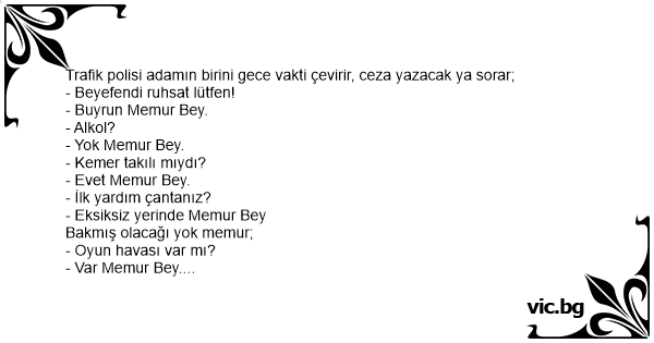 Trafik polisi adamın birini gece vakti çevirir, ceza yazacak ya sorar;