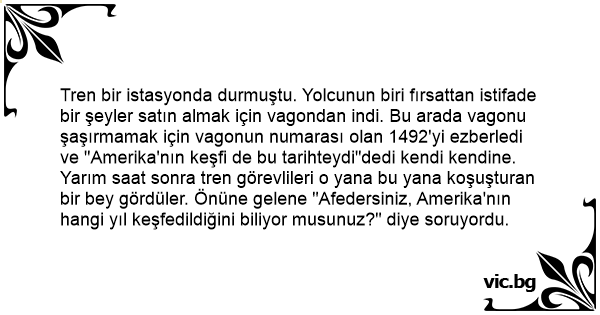 Tren bir istasyonda durmuştu. Yolcunun biri fırsattan istifade bir şeyler satın almak için vagondan indi. Bu arada vagonu şaşırmamak için vagonun numarası olan 1492'yi ezberledi ve "Amerika'nın keşfi de bu tarihteydi"dedi kendi kendine. Yarım saat sonra tren görevlileri o yana bu yana koşuşturan bir bey gördüler. Önüne gelene "Afedersiniz, Amerika'nın hangi yıl keşfedildiğini biliyor musunuz?" diye soruyordu.