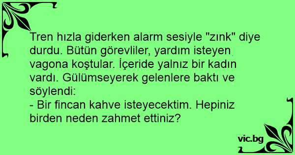 Tren hızla giderken alarm sesiyle "zınk" diye durdu. Bütün görevliler, yardım isteyen vagona koştular. İçeride yalnız bir kadın vardı. Gülümseyerek gelenlere baktı ve söylendi: