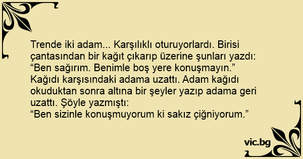 Kağıdı karşısındaki adama uzattı. Adam kağıdı okuduktan sonra altına bir şeyler yazıp adama geri uzattı. Şöyle yazmıştı: