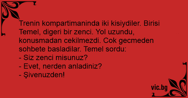 Trenin kompartimaninda iki kisiydiler. Birisi Temel, digeri bir zenci. Yol uzundu, konusmadan cekilmezdi. Сок gecmeden sohbete basladilar. Temel sordu: