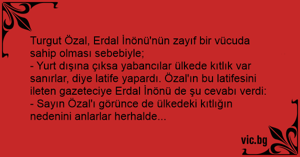 - Yurt dışına çıksa yabancılar ülkede kıtlık var sanırlar, diye latife yapardı. Özal'ın bu latifesini ileten gazeteciye Erdal İnönü de şu cevabı verdi: