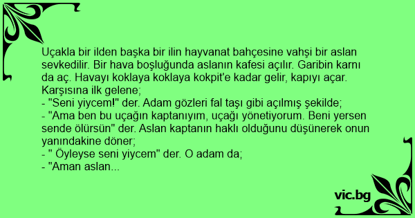 - "Ama ben bu uçağın kaptanıyım, uçağı yönetiyorum. Beni yersen sende ölürsün" der. Aslan kaptanın haklı olduğunu düşünerek onun yanındakine döner;