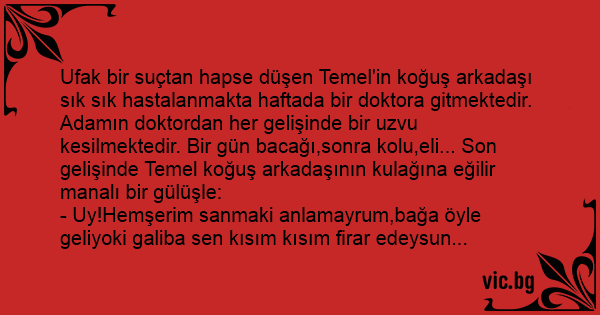 Ufak bir suçtan hapse düşen Temel'in koğuş arkadaşı sık sık hastalanmakta haftada bir doktora gitmektedir. Adamın doktordan her gelişinde bir uzvu kesilmektedir. Bir gün bacağı,sonra kolu,eli... Son gelişinde Temel koğuş arkadaşının kulağına eğilir manalı bir gülüşle: