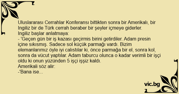 Uluslararası Cerrahlar Konferansı bittikten sonra bir Amerikalı, bir Ingiliz bir de Türk cerrah beraber bir şeyler içmeye giderler.