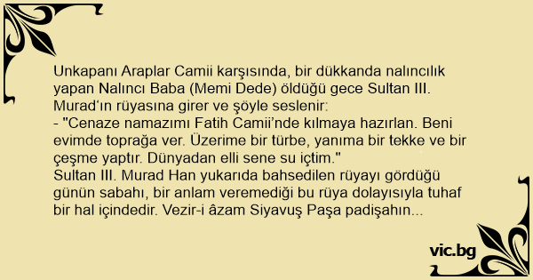 Unkapanı Araplar Camii karşısında, bir dükkanda nalıncılık yapan Nalıncı Baba (Memi Dede) öldüğü gece Sultan III. Murad‘ın rüyasına girer ve şöyle seslenir: