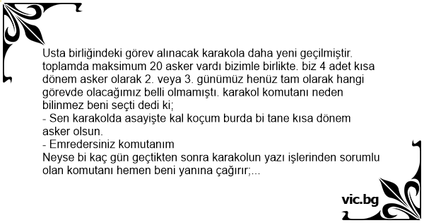 Usta birliğindeki görev alınacak karakola daha yeni geçilmiştir. toplamda maksimum 20 asker vardı bizimle birlikte. biz 4 adet kısa dönem asker olarak 2. veya 3. günümüz henüz tam olarak hangi görevde olacağımız belli olmamıştı. karakol komutanı neden bilinmez beni seçti dedi ki;