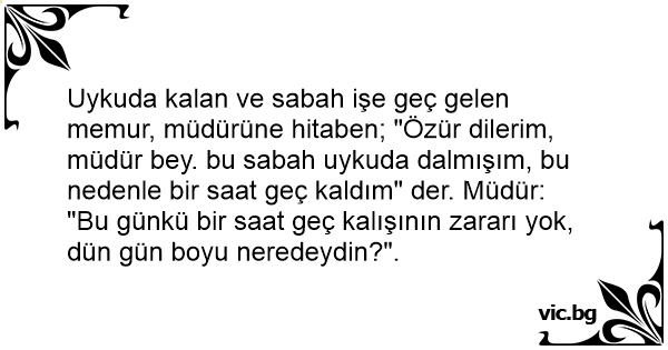 Uykuda kalan ve sabah işe geç gelen memur, müdürüne hitaben; "Özür dilerim, müdür bey. bu sabah uykuda dalmışım, bu nedenle bir saat geç kaldım" der. Müdür: