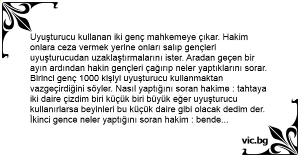 Uyuşturucu kullanan iki genç mahkemeye çıkar. Hakim onlara ceza vermek yerine onları salıp gençleri uyuşturucudan uzaklaştırmalarını ister. Aradan geçen bir ayın ardından hakin gençleri çağırıp neler yaptıklarını sorar. Birinci genç 1000 kişiyi uyuşturucu kullanmaktan vazgeçirdiğini söyler. Nasıl yaptığını soran hakime : tahtaya iki daire çizdim biri küçük biri büyük eğer uyuşturucu kullanırlarsa beyinleri bu küçük daire gibi olacak dedim der. İkinci gence neler yaptığını soran hakim : bende 1000 kişiyi uyuşturucu kullanmaktan vazgeçirdim. Nasıl yaptığını sorunca : tahtaya iki daire çizdim biri küçük diğeri büyük eğer uyuşturucu kullanırsanız hapse girersiniz ve g*tünüz bu küçük daire kadarken hapisten çıkarken bu büyük daire kadar olur dedim.