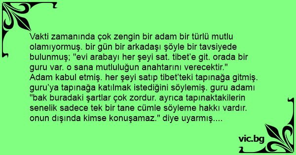 Vakti zamanında çok zengin bir adam bir türlü mutlu olamıyormuş. bir gün bir arkadaşı şöyle bir tavsiyede bulunmuş; "evi arabayı her şeyi sat. tibet’e giт. orada bir guru var. o sana mutluluğun anahtarını verecektir."