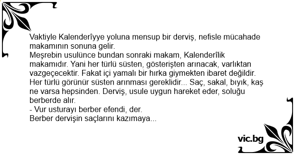 Dervişlik bu... Sövene dilsiz, vurana elsiz gerek. Kaideyi bozmaz derviş. Ses çıkarmaz, usulca kalkar yerinden. Berber mahcup, fakat korkmuştur. Ses çıkaramaz.