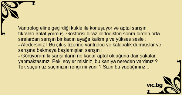 Vantrolog eline geçirdiği kukla ile konuşuyor ve aptal sarışın fıkraları anlatıyormuş. Gösterisi biraz ilerledikten sonra birden orta sıralardan sarışın bir kadın ayağa kalkmış ve yükses sesle :