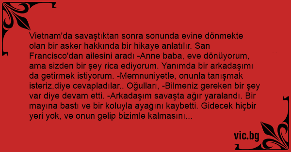 Vietnam'da savaştıktan sonra sonunda evine dönmekte olan bir asker hakkında bir hikaye anlatılır. San Francisco'dan ailesini aradı -Anne baba, eve dönüyorum, ama sizden bir şey rica ediyorum. Yanımda bir arkadaşımı da getirmek istiyorum. -Memnuniyetle, onunla tanışmak isteriz,diye cevapladılar.. Oğulları, -Bilmeniz gereken bir şey var diye devam etti. -Arkadaşım savaşta ağır yaralandı. Bir mayına bastı ve bir koluyla ayağını kaybetti. Gidecek hiçbir yeri yok, ve onun gelip bizimle kalmasını istiyorum. -Bunu duyduğuma üzüldüm oğlum. Belki onun başka bir yer bulmasına yardımcı olabiliriz. -Hayır. Anne, baba, onun bizimle yaşamasını istiyorum. -Oğlum, dedi babası, -Bizden ne istediğini bilmiyorsun. Onun gibi özürlü biri bize korkunç bir yük olur. Bizim kendi hayatımiz var, ve bunun gibi bir şeyin hayatımıza engel olmasına izin veremeyiz. Bence bu arkadaşını unutup eve dönmelisin. O kendi başının çaresine bakacaktır. Oğlu o anda telefonu kapattı. Ailesi ondan bir süre haber alamadı. Ama birkaç gün sonra, San Francisco polisinden bir telefon geldi. Oğullarının yüksek bir binadan düşüp öldüğünü öğrendiler. Polis bunun intihar olduğuna inanıyordu. Üzüntü dolu anne-baba hemen San Francisco'ysa uçtular ve Oğullarının cesedini tespit etmek için şehir morguna götürüldüler. Onu tanıdılar, ve bilmedikleri bir şey daha öğrenince dehşete düştüler: Oğullarının sadece bir kolu ve bir bacağı vardı. Bu hikayedeki aile de bir çoğumuz gibi. Güzel olan yada birlikte olmaktan zevk aldığımız insanları sevmek bizim için çok kolay, ama bize rahatsızlık veren yada yanlarında kendimizi rahatsız hissettiğimiz insanları sevmiyoruz. Bizim kadar sağlıklı, Güzel yada akilli olmayan insanların yanından uzak durmayı tercih ediyoruz. Ney seki, bize bu şekilde davranmayan biri var. Biz ne kadar bozulmuş olursak olalım, bizi sonsuz ailesinin yanına çağıran şartsız sevgiyle seven biri. Bu gece, uyumadan önce, insanları olduğu gibi kabul edebilmemiz ve bizden farklı olanlara karşı daha anlayışlı olabilmemiz için gereken gücü vermesi için Allah'a kısa bir dua edelim.