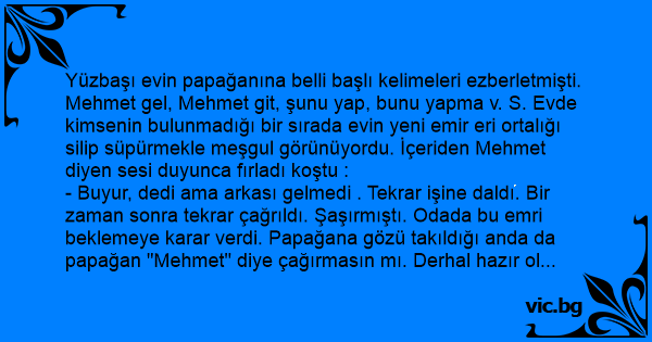 Yüzbaşı evin papağanına belli başlı kelimeleri ezberletmişti. Mehmet gel, Mehmet giт, şunu yap, bunu yapma v. S. Evde kimsenin bulunmadığı bir sırada evin yeni emir eri ortalığı silip süpürmekle meşgul görünüyordu. İçeriden Mehmet diyen sesi duyunca fırladı koştu :