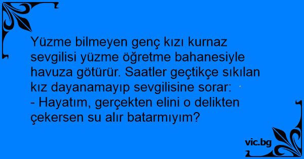 Yüzme bilmeyen genç kızı kurnaz sevgilisi yüzme öğretme bahanesiyle havuza götürür. Saatler geçtikçe sıkılan kız dayanamayıp sevgilisine sorar:
