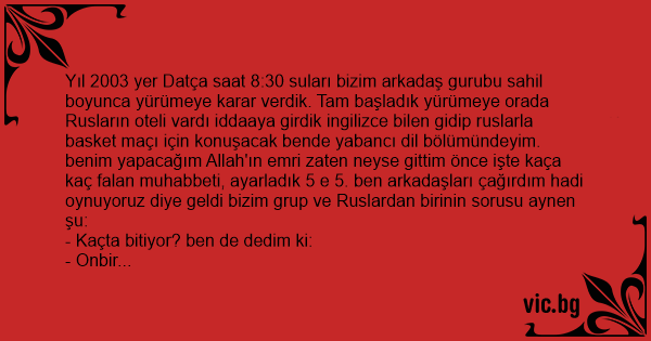 Yıl 2003 yer Datça saat 8:30 suları bizim arkadaş gurubu sahil boyunca yürümeye karar verdik. Tam başladık yürümeye orada Rusların oteli vardı iddaaya girdik ingilizce bilen gidip ruslarla basket maçı için konuşacak bende yabancı dil bölümündeyim. benim yapacağım Allah'ın emri zaten neyse gittim önce işte kaça kaç falan muhabbeti, ayarladık 5 e 5. ben arkadaşları çağırdım hadi oynuyoruz diye geldi bizim grup ve Ruslardan birinin sorusu aynen şu: