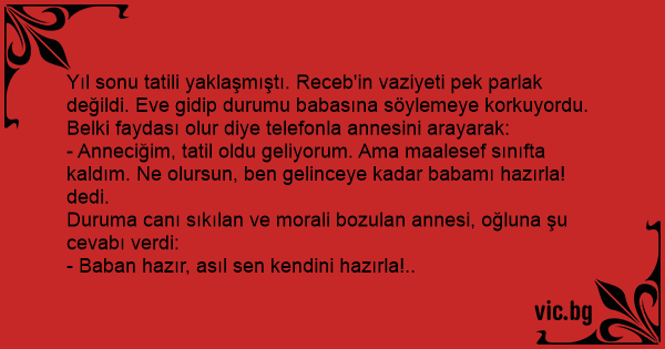 - Anneciğim, tatil oldu geliyorum. Ama maalesef sınıfta kaldım. Ne olursun, ben gelinceye kadar babamı hazırla! dedi.