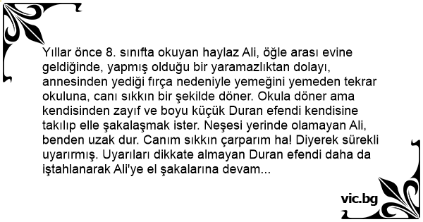 Yıllar önce 8. sınıfta okuyan haylaz Ali, öğle arası evine geldiğinde, yapmış olduğu bir yaramazlıktan dolayı, annesinden yediği fırça nedeniyle yemeğini yemeden tekrar okuluna, canı sıkkın bir şekilde döner. Okula döner ama kendisinden zayıf ve boyu küçük Duran efendi kendisine takılıp elle şakalaşmak ister. Neşesi yerinde olamayan Ali, benden uzak dur. Canım sıkkın çarparım ha! Diyerek sürekli uyarırmış. Uyarıları dikkate almayan Duran efendi daha da iştahlanarak Ali'ye el şakalarına devam ediyor. Ali de Duran'a vurmamak için dişini sıkıp duruyor, ama bir türlü Duran'ı kendisinden uzaklaştıramıyor. Ali en son dayanamayıp Duran'ın gözünün üstüne yumruğu indiriyor. Nasıl yumruk attıysa, anında Duran'ın gözü morarıp şişiyor. Yumruğun cezasını Duran'ın babası ve sınıf öğretmeninden yediği dayakla ödüyor. Yıllar sonra çelimsiz, zayıf olan Duran, Boyu ve kilosuyla Ali'den Çok daha babayiğit biri oluyor. Bir gün Ali çarşı pazarda dolaşırken, Duran birden karşına dikiliveriyor. Kafasını indirip, haydi bir yumruk daha at da göreyim der. Ali duruma bakıyor ama, yumruk atması mümkün değil. Kaçsa, erkekliğe yakışmaz, yumruk atsa gözünü hastanede açacak. Kafasını kaldırıp Duran'a bakan Ali, Duran'cığım, dengeler değişti: bir yumruk atsam beni kim elinde alacak deyip, Duran'a sarılıp gözlerinden öpmekten başka çare bulamıyor.