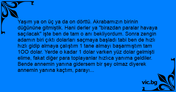Yaşım ya on üç ya da on dörttü. Akrabamızın birinin düğününe gitmiştik. Hani derler ya "birazdan paralar havaya saçılacak" işte ben de tam o anı bekliyordum. Sonra zengin adamın biri çıktı dolarları saçmaya başladı tabi ben de hızlı hızlı gidip almaya çalıştım 1 tane almayı başarmıştım tam 1OO dolar. Yerde o kadar 1 dolar varken yüz dolar gelmişti elime, fakat diğer para toplayanlar hızlıca yanıma geldiler.