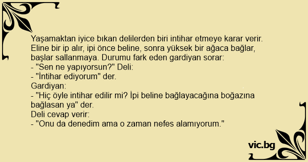 Yaşamaktan iyice bıkan delilerden biri intihar etmeye karar verir. Eline bir ip alır, ipi önce beline, sonra yüksek bir ağaca bağlar, başlar sallanmaya. Durumu fark eden gardiyan sorar:
