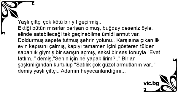Ektiği bütün mısırlar perişan olmuş, buğday deseniz öyle, elinde satabileceği tek geçinebilme ümidi armut var. Doldurmuş sepete tutmuş şehrin yolunu.. Karşısına çıkan ilk evin kapısını çalmış, kapıyı tamamen içini gösteren tülden sabahlık giymiş bir sarışın açmış, seksi bir ses tonuyla "Evet tatlım.." demiş,"Senin için ne yapabilirim?.." Bir an şaşkınlığından kurtulup "Satılık çok güzel armutlarım var.." demiş yaşlı çiftçi.. Adamın heyecanlandığını hisseden afetoyununa devam edip sabahlığın üst kısmını açıp "Armutların bu kadar iri ve sert mi?.." diye sormuş..