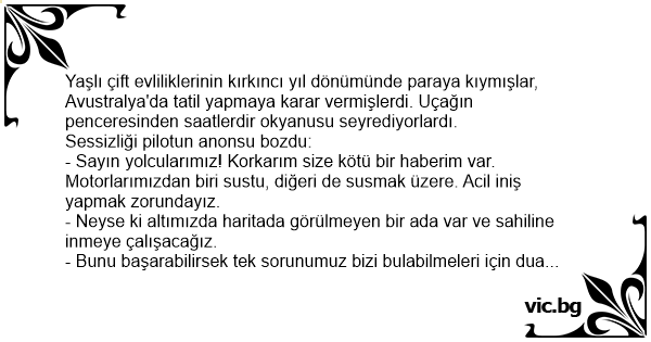 Yaşlı çift evliliklerinin kırkıncı yıl dönümünde paraya kıymışlar, Avustralya'da tatil yapmaya karar vermişlerdi. Uçağın penceresinden saatlerdir okyanusu seyrediyorlardı.