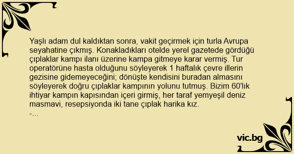 Yaşlı adam dul kaldıktan sonra, vakit geçirmek için turla Avrupa seyahatine çıkmış. Konakladıkları otelde yerel gazetede gördüğü çıplaklar kampı ilanı üzerine kampa gitmeye karar vermiş. Tur operatörüne hasta olduğunu söyleyerek 1 haftalık çevre illerin gezisine gidemeyeceğini; dönüşte kendisini buradan almasını söyleyerek doğru çıplaklar kampının yolunu tutmuş. Bizim 60'lık ihtiyar kampın kapısından içeri girmiş, her taraf yemyeşil deniz masmavi, resepsiyonda iki tane çıplak harika kız.