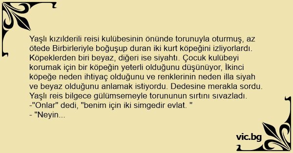 Yaşlı kızılderili reisi kulübesinin önünde torunuyla oturmuş, az ötede Birbirleriyle boğuşup duran iki kurt köpeğini izliyorlardı. Köpeklerden biri beyaz, diğeri ise siyahtı. Çocuk kulübeyi korumak için bir köpeğin yeterli olduğunu düşünüyor, İkinci köpeğe neden ihtiyaç olduğunu ve renklerinin neden illa siyah ve beyaz olduğunu anlamak istiyordu. Dedesine merakla sordu. Yaşlı reis bilgece gülümsemeyle torununun sırtını sıvazladı. -"Onlar" dedi, "benim için iki simgedir evlat. "