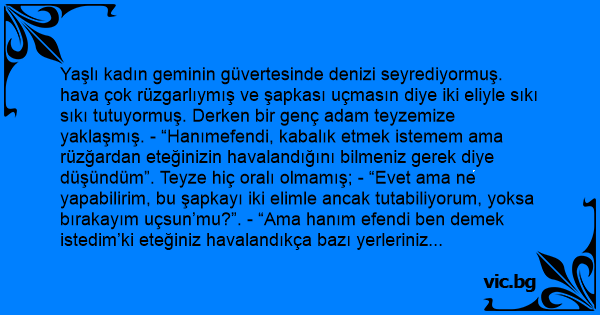 Yaşlı kadın geminin güvertesinde denizi seyrediyormuş. hava çok rüzgarlıymış ve şapkası uçmasın diye iki eliyle sıkı sıkı tutuyormuş. Derken bir genç adam teyzemize yaklaşmış. - “Hanımefendi, kabalık etmek istemem ama rüzğardan eteğinizin havalandığını bilmeniz gerek diye düşündüm”. Teyze hiç oralı olmamış; - “Evet ama ne yapabilirim, bu şapkayı iki elimle ancak tutabiliyorum, yoksa bırakayım uçsun’mu?”. - “Ama hanım efendi ben demek istedim’ki eteğiniz havalandıkça bazı yerleriniz görünüyor!”. Teyzemiz adama şöyle bir bakmış ve gülümsemiş; - “Evladım. Eteğimin altında görünen 85 senelik ama ben bu şapkayı dün aldım!”.