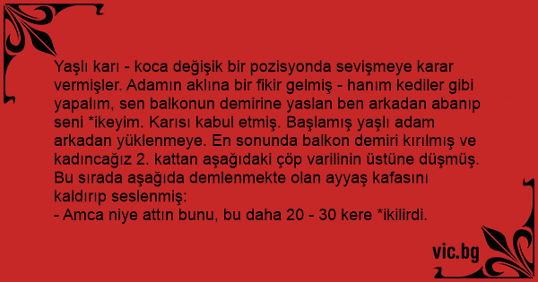 Yaşlı karı - koca değişik bir pozisyonda sevişmeye karar vermişler. Adamın aklına bir fikir gelmiş - hanım kediler gibi yapalım, sen balkonun demirine yaslan ben arkadan abanıp seni *ikeyim. Karısı kabul etmiş. Başlamış yaşlı adam arkadan yüklenmeye. En sonunda balkon demiri kırılmış ve kadıncağız 2. kattan aşağıdaki çöp varilinin üstüne düşmüş. Bu sırada aşağıda demlenmekte olan ayyaş kafasını kaldırıp seslenmiş: