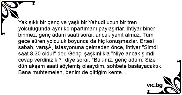 Yakışıklı bir genç ve yaşlı bir Yahudi uzun bir tren yolculuğunda aynı kompartımanı paylaşırlar. İhtiyar biner binmez, genç adam saati sorar, ancak yanıt almaz. Tüm gece süren yolculuk boyunca da hiç konuşmazlar. Ertesi sabah, varışÂ¸ istasyonuna gelmeden önce, ihtiyar "Şimdi saat 8.30 oldu!" der. Genç, şaşkınlıkla "Niye ancak şimdi cevap verdiniz ki?" diye sorar. "Bakınız, genç adam: Size dün akşam saati söylemiş olsaydım, sohbete baslayacaktık. Bana muhtemelen, benim de gittiğim kente yolculuk ettiğinizi ve belki de oraya ilk kez gittiğinizi söyleyecektiniz. Ben de, iyi bir insan olduğum için, sizi evime davet edecektim. Orada kızım ile tanışacaktınız. Çok güzel bir kız olduğu için, onu kesinlikle beğenecektiniz. Eh, siz de çirkin sayılmazsınız - o da, sizi beğenecekti. Kuvvetle ihtimaldir ki, bu iş evliliğe kadar gidecekti. Ben de düşündüm: Saati bile olmayan meteliksiz bir damatla, benim ne işim var.