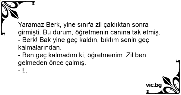 Yaramaz Веrк, yine sınıfa zil çaldıktan sonra girmişti. Bu durum, öğretmenin canına tak etmiş.