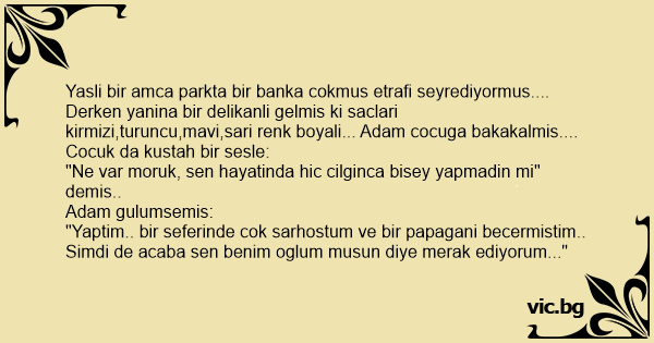 Derken yanina bir delikanli gelmis ki saclari kirmizi,turuncu,mavi,sari renk boyali... Adam cocuga bakakalmis.... Cocuk da kustah bir sesle: