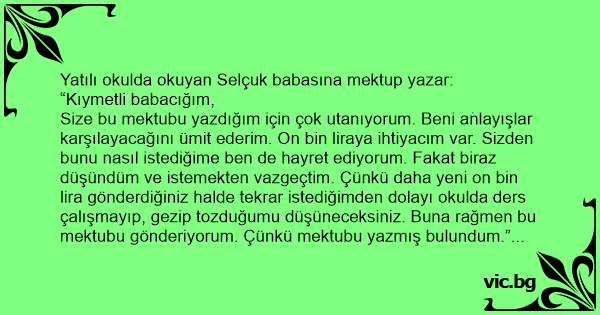 Size bu mektubu yazdığım için çok utanıyorum. Beni anlayışlar karşılayacağını ümit ederim. On bin liraya ihtiyacım var. Sizden bunu nasıl istediğime ben de hayret ediyorum. Fakat biraz düşündüm ve istemekten vazgeçtim. Çünkü daha yeni on bin lira gönderdiğiniz halde tekrar istediğimden dolayı okulda ders çalışmayıp, gezip tozduğumu düşüneceksiniz. Buna rağmen bu mektubu gönderiyorum. Çünkü mektubu yazmış bulundum.”