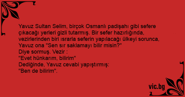 Yavuz Sultan Selim, birçok Osmanlı padişahı gibi sefere çıkacağı yerleri gizli tutarmış. Bir sefer hazırlığında, vezirlerinden biri ısrarla seferin yapılacağı ülkeyi sorunca, Yavuz ona "Sen sır saklamayı bilir misin?"