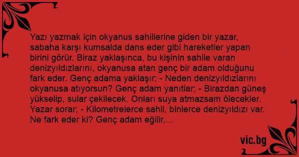Yazı yazmak için okyanus sahillerine giden bir yazar, sabaha karşı kumsalda dans eder gibi hareketler yapan birini görür. Biraz yaklaşınca, bu kişinin sahile varan denizyıldızlarını, okyanusa atan genç bir adam olduğunu fark eder. Genç adama yaklaşır; - Neden denizyıldızlarını okyanusa atıyorsun? Genç adam yanıtlar; - Birazdan güneş yükselip, sular çekilecek. Onları suya atmazsam ölecekler. Yazar sorar; - Kilometrelerce sahil, binlerce denizyıldızı var. Ne fark eder ki? Genç adam eğilir, yerden bir denizyıldızı daha alır, okyanusa fırlatır. - Onun için farketti ama.