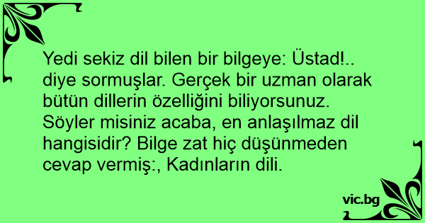 Yedi sekiz dil bilen bir bilgeye: Üstad!.. diye sormuşlar. Gerçek bir uzman olarak bütün dillerin özelliğini biliyorsunuz. Söyler misiniz acaba, en anlaşılmaz dil hangisidir? Bilge zat hiç düşünmeden cevap vermiş:, Kadınların dili.