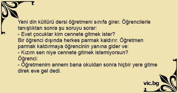 Yeni din kültürü dersi öğretmeni sınıfa girer. Öğrencilerle tanıştıktan sonra şu soruyu sorar: