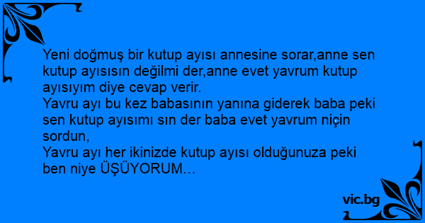 Yeni doğmuş bir kutup ayısı annesine sorar,anne sen kutup ayısısın değilmi der,anne evet yavrum kutup ayısıyım diye cevap verir.