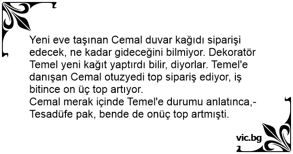 Yeni eve taşınan Cemal duvar kağıdı siparişi edecek, ne kadar gideceğini bilmiyor. Dekoratör Temel yeni kağıt yaptırdı bilir, diyorlar. Temel'e danışan Cemal otuzyedi top sipariş ediyor, iş bitince on üç top artıyor.