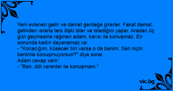 Yeni evlenen gelin ve damat gerdeğe girerler. Fakat damat, gelinden ısrarla ters ilişki ister ve istediğini yapar. Aradan üç gün geçmesine rağmen adam, karısı ile konuşmaz. En sonunda kadın dayanamaz ve: