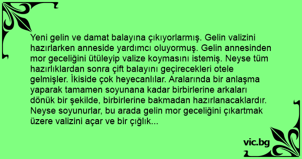 Yeni gelin ve damat balayına çıkıyorlarmış. Gelin valizini hazırlarken anneside yardımcı oluyormuş. Gelin annesinden mor geceliğini ütüleyip valize koymasını istemiş. Neyse tüm hazırlıklardan sonra çift balayını geçirecekleri otele gelmişler. İkiside çok heyecanlılar. Aralarında bir anlaşma yaparak tamamen soyunana kadar birbirlerine arkaları dönük bir şekilde, birbirlerine bakmadan hazırlanacaklardır. Neyse soyunurlar, bu arada gelin mor geceliğini çıkartmak üzere valizini açar ve bir çığlık atar; - " Hii mor ve buruşuk". oradan bir ses; - " Hani birbirimize bakmayacaktık".
