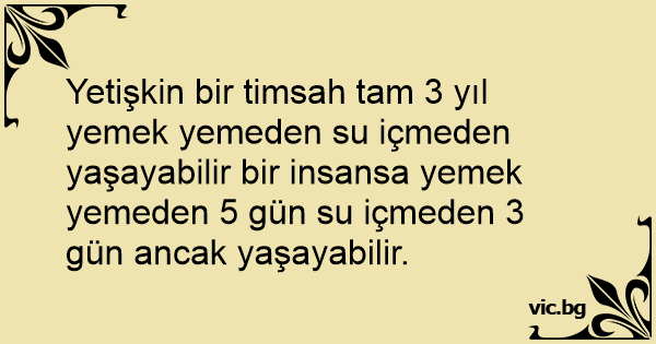 Yetişkin bir timsah tam 3 yıl yemek yemeden su içmeden yaşayabilir bir insansa yemek yemeden 5 gün su içmeden 3 gün ancak yaşayabilir.