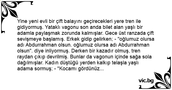 Yine yeni evli bir çift balayını geçirecekleri yere tren ile gidiyormuş. Yataklı vagonu son anda bilet alan yaşlı bir adamla paylaşmak zorunda kalmışlar. Gece üst ranzada çift sevişmeye başlamış. Erkek gidip gelirken; - "oğlumuz olursa adı Abdurrahman olsun. oğlumuz olursa adı Abdurrahman olsun". diye inliyormuş. Derken bir kazadır olmuş, tren raydan çıkıp devrilmiş. Bunlar da vagonun içinde sağa sola dağılmışlar. Kadın düştüğü yerden kalkıp telaşla yaşlı adama sormuş; - "Kocamı gördünüz mü?". Yaşlı adam ekşimiş bir suratla olduğu yerden doğrulmuş, tiksintiyle alnını silip; - "Kocanızı bilmem ama sizin Abrurrahman burda!".