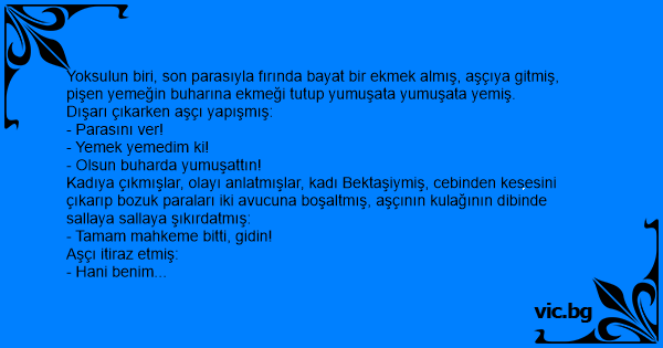 Yoksulun biri, son parasıyla fırında bayat bir ekmek almış, aşçıya gitmiş, pişen yemeğin buharına ekmeği tutup yumuşata yumuşata yemiş.