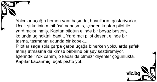 Kapılar kapanmış, uçak pistte yol almaya başlamış. Uçak hızlanmış, pistin sonu yaklaşmış. Yolcular panikte. Beton pistin bitip çimlerin başladığını gören yolcular, dayanamamış basmışlar çığlığı. Tam o anda kaptan pilot da önündeki levyeyi sonuna kadar çekmiş.
