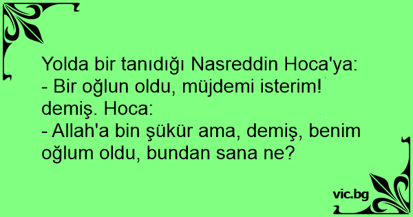 - Bir oğlun oldu, müjdemi isterim! demiş. Hoca: