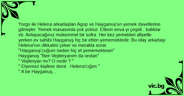Yorgo ile Helena arkadaşları Agop ve Hayganuş'un yemek davetlerine gitmişler. Yemek masasında yok yoktur. Etlerin enva yi çeşidi , balıklar vb. Anlayacağınız mükemmel bir sofra. Her kez yemekleri afiyetle yerken ev sahibi Hayganuş hiç bir etten yememektedir. Bu olay arkadaşı Helena'nın dikkatini çeker ve merakla sorar.