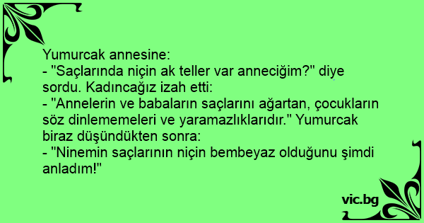 - "Annelerin ve babaların saçlarını ağartan, çocukların söz dinlememeleri ve yaramazlıklarıdır." Yumurcak biraz düşündükten sonra: