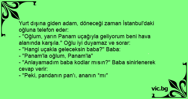 - "Oğlum, yarın Panam uçağıyla geliyorum beni hava alanında karşıla." Oğlu iyi duyamaz ve sorar: